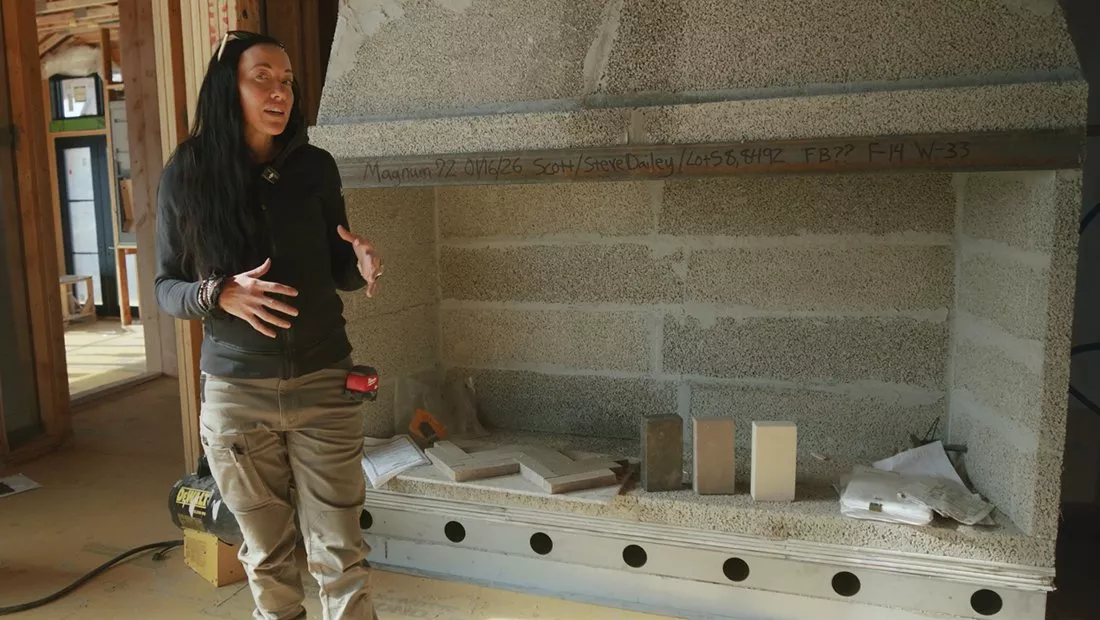 In the 9th episode, Stephanie tours the home’s newly installed mechanical systems. With multiple zones requiring climate isolation, the venting layout is complex—especially with HOA rules requiring all exterior vents to run through chimneys. Stephanie also highlights the home’s primary fireplace: a 72″ Isokern Magnum made from Icelandic volcanic pumice that will anchor the living space.